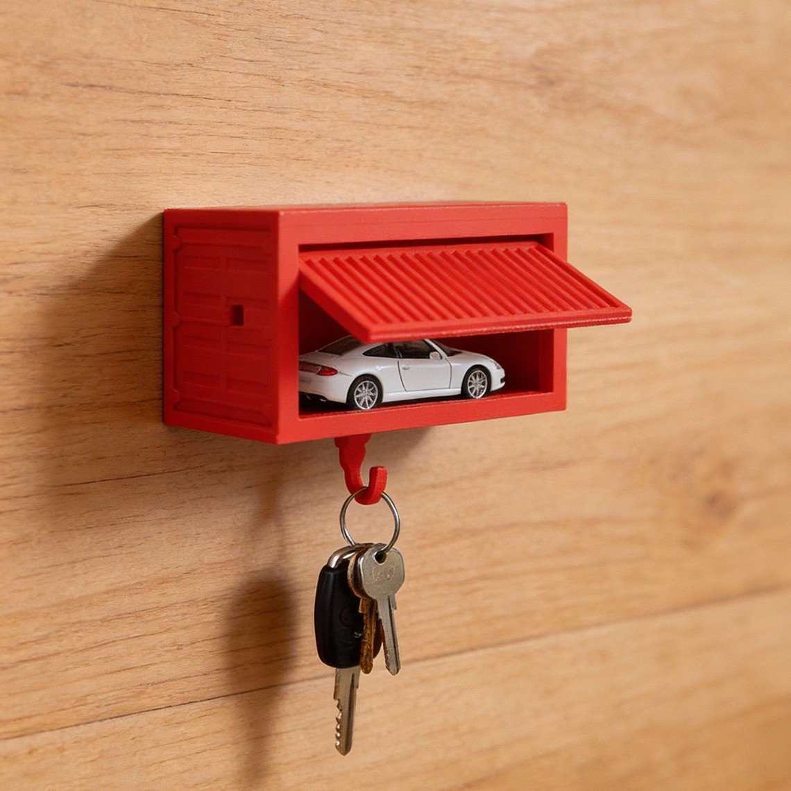 Keep your keys organized with this unique wall-mounted mini garage key holder! Designed like a tiny garage, it features a flip-up door, toy car display, and hidden hook underneath for holding keys, lanyards, or accessories. Fun, stylish, and perfect for car lovers or as a cool gift.