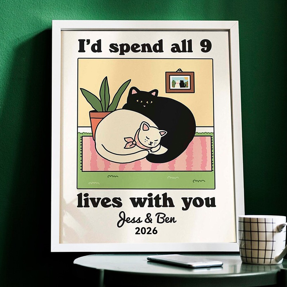 This illustration features 2 cute cats cuddling up together. This print has a cute positive quote on it that reads ‘I'd spend all 9 lives with you’. The vintage design adds a pop of color and warmth, making it a perfect addition to your living room, bedroom, or office space. It's an ideal gift for housewarmings, weddings, birthdays, Christmas, or any special occasion.