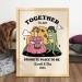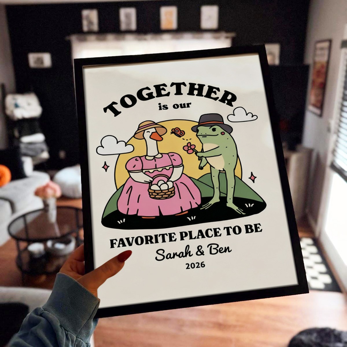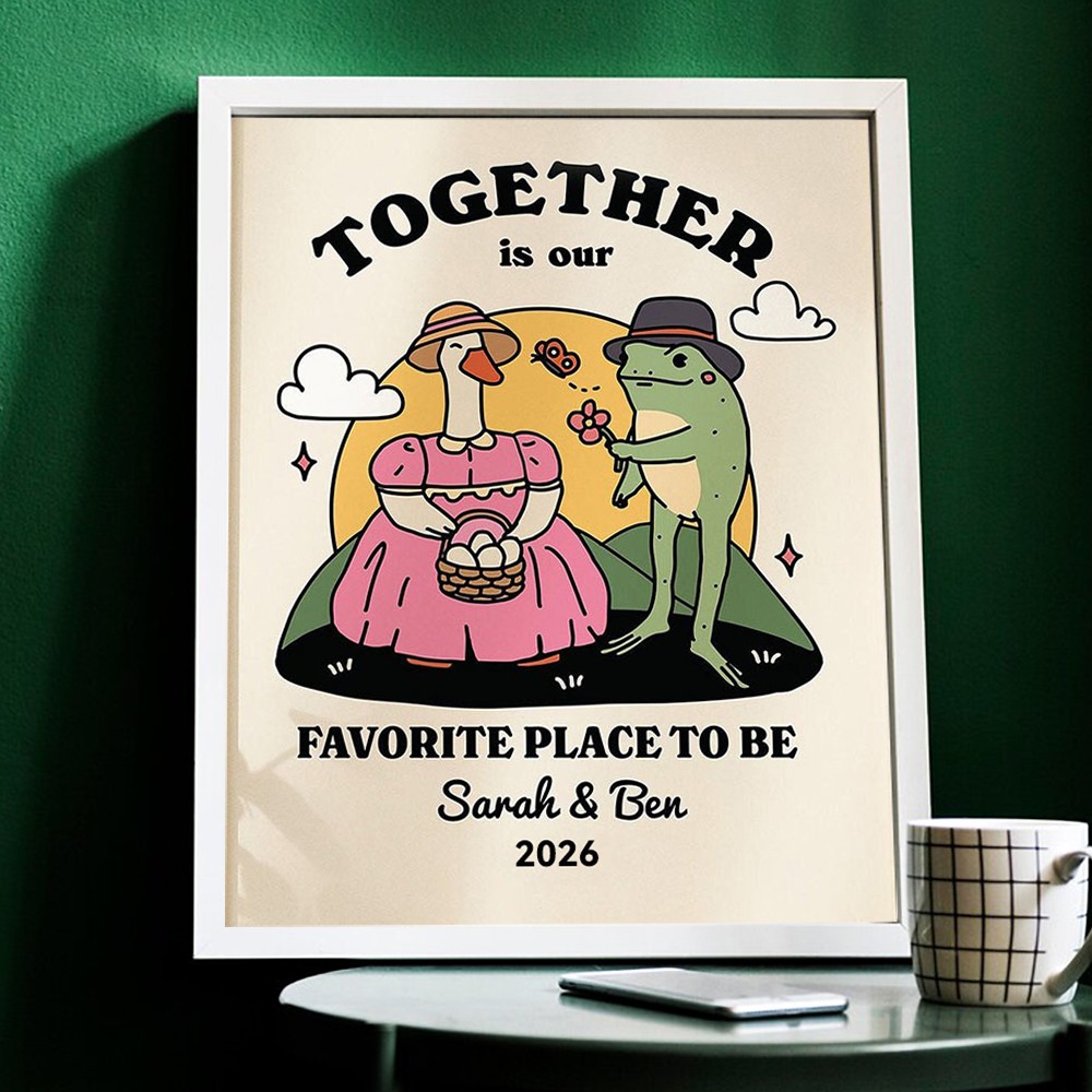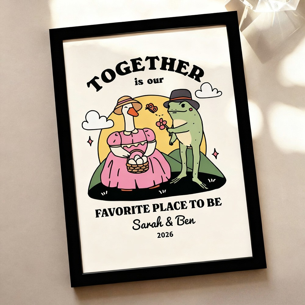 This charming illustration features two retro-style frogs enjoying each other’s company, paired with a cute and humorous quote that reads “Together until we croak.” With its warm vintage aesthetic, this print brings a touch of color, personality, and love to any space—whether it’s your living room, bedroom, or office—and makes a thoughtful, fun gift for housewarmings, weddings, birthdays, Christmas, or any special occasion.
